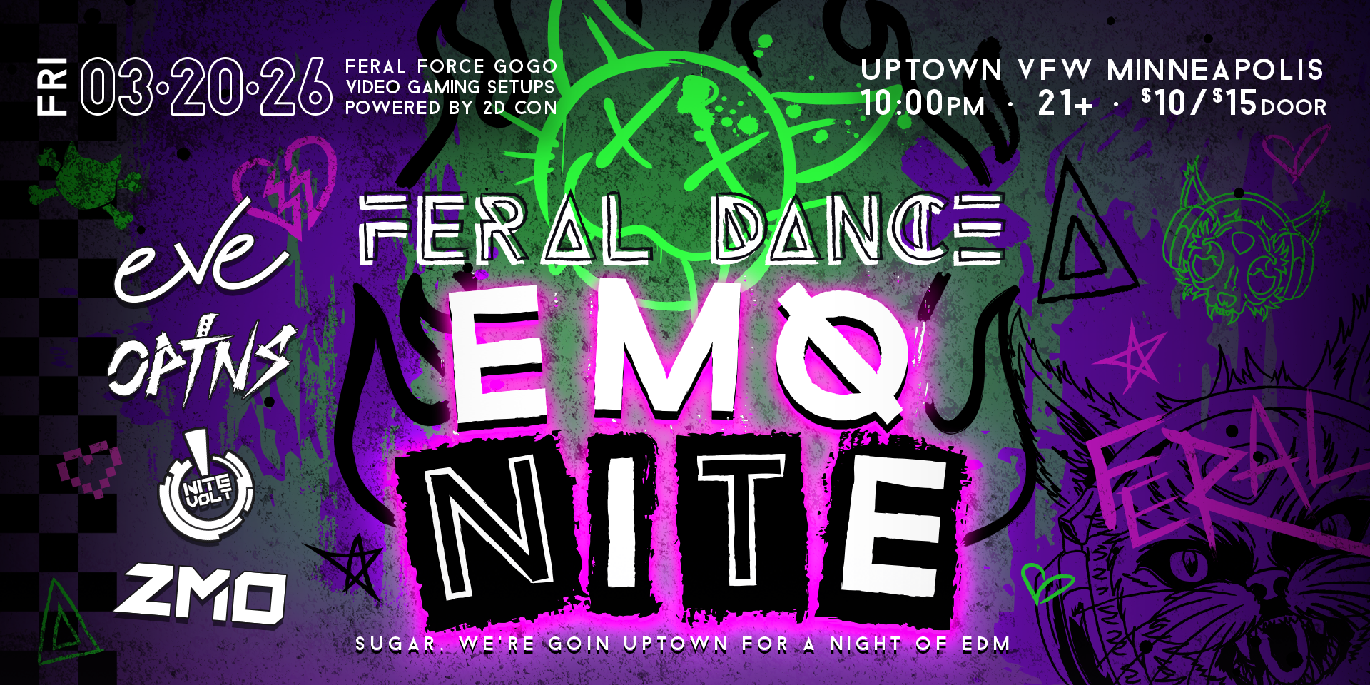 Feral Dance: Emo Nite Friday, March 20, 2026 10:00 PM Saturday, March 21, 2026 2:00 AM Uptown VFW 2916 Lyndale Avenue South Minneapolis, MN, 55408 United States (map) Google Calendar ICS 03.20.26 Nitevolt | Optns | Eve | ZMO 21+ Show-Live music-Gogo dancing by FER4L FORCE-Photo Booth-Gaming setups by 2D Con-Dress in your Emo best!$10 - Advanced$15 - At The Door TICKETS